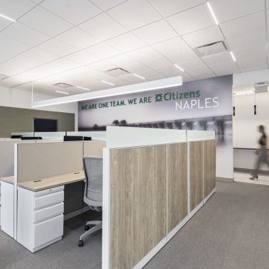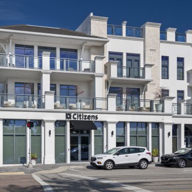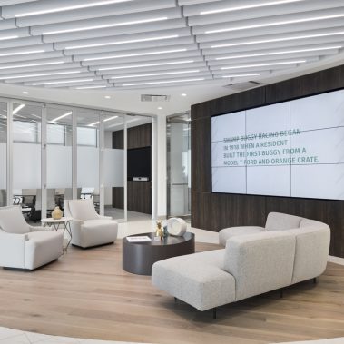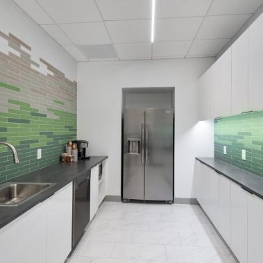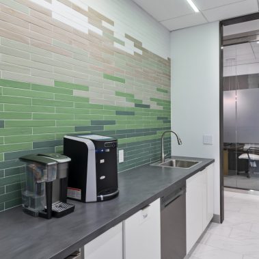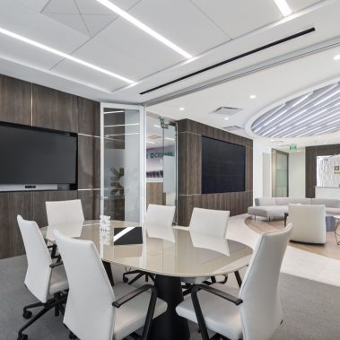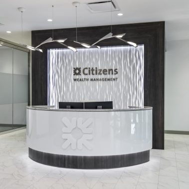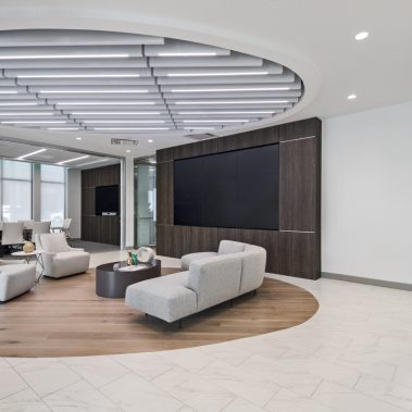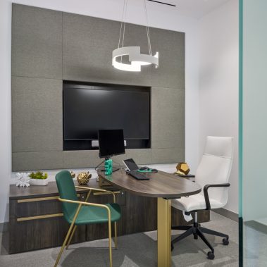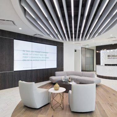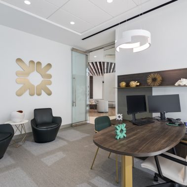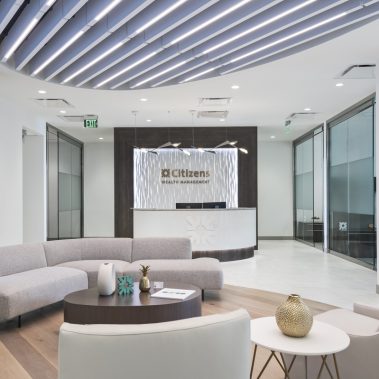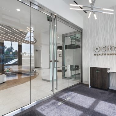 This 1-story, 3,500 sq. ft. remodel includes a brand new updated lobby, partner suite, conference room, executive office, 2 managerial offices, and a 24-hour access entry vestibule with an ATM. Some of the finishes include porcelain floor tile with wood lay-in, glass panel folding doors in the conference room, concealed closers, and a 10-ft high frameless storefront system with 3-quarter inch glass.