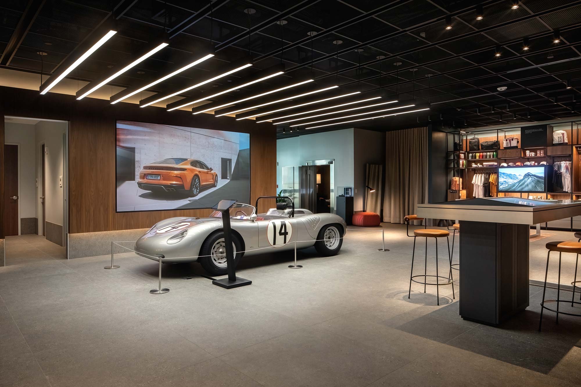 Porsche Studio Naples is a boutique showroom that redefines the automotive experience on Naples’ 5th Avenue South. The space features a premium coffee and beverage bar, refined private meeting lounges, and concierge-style hospitality. At its center, a classic Porsche is showcased under custom lighting, creating a striking focal point. It represents Florida’s first Porsche Studio and one of only five across the U.S.